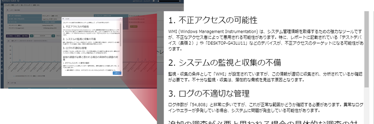 AIが分析しやすいレポート/ アラートを標準で出力できるのがLogStareの強み。