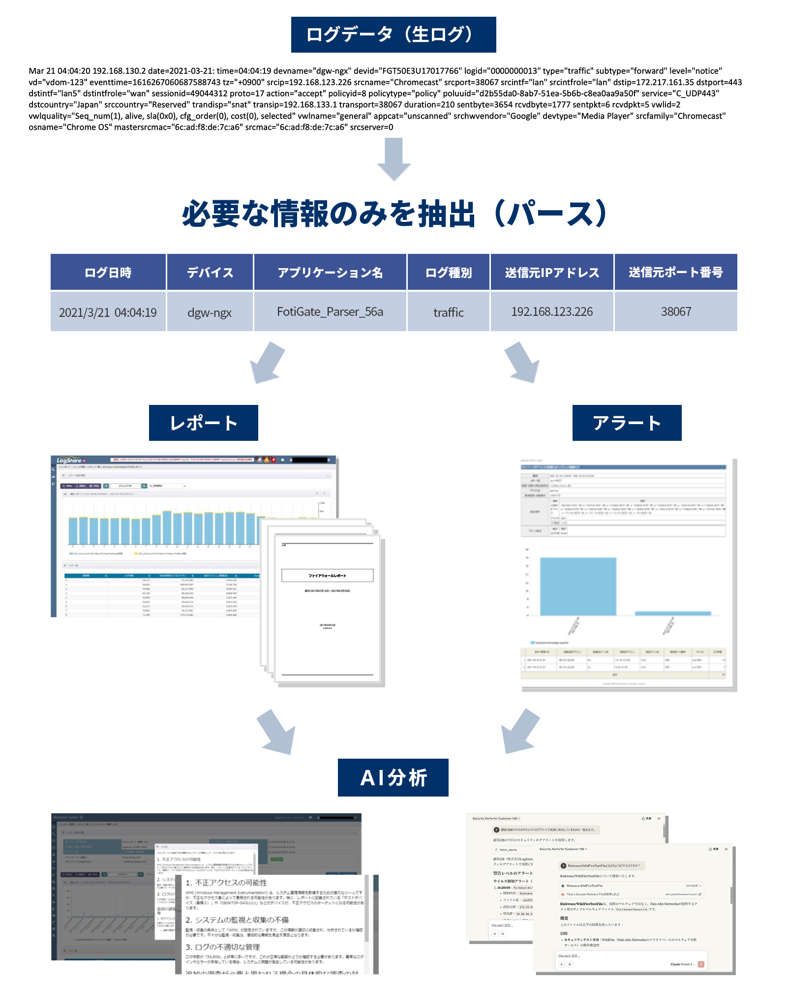 見やすく成形(パース)し、レポートやアラートを出力します。